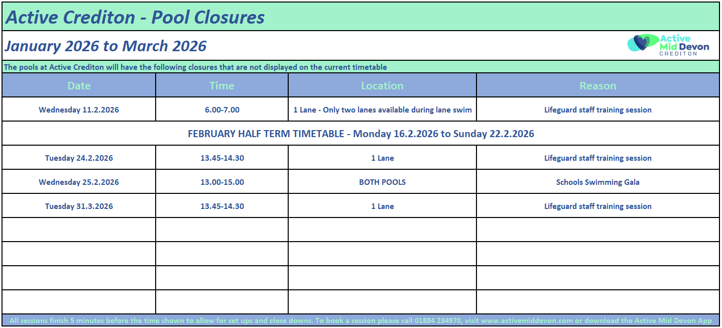 Active Crediton Pool Timetable